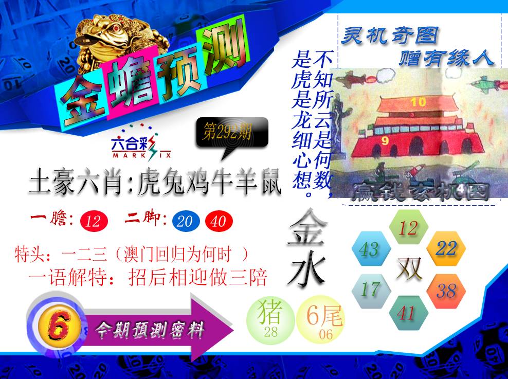 292期正版天机诗 三字小路弯成八 。送:牛猴羊鸡猪。 推荐:1 3 0头+蓝绿波(开?00) |